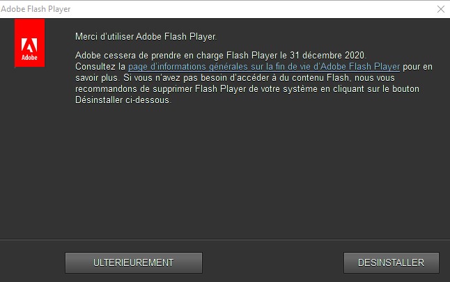 La société Adobe a annoncé la fin du support pour Adobe Flash Player en cette fin d’année. Flash Player était installé par défaut sur tous les postes Windows installés par le pôle des ressources informatiques.