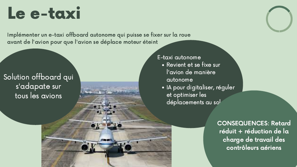 “We focused our project on the airport of tomorrow. Our idea was to implement off-board e-taxis that can autonomously dock (and undock) to the landing gear of aircraft and drive them through the terminal. We plan to accompany the system with artificial intelligence to optimise runway travel times and thus reduce traffic. The e-taxi service would be coupled to a digitalisation of the control towers and an interface for users to communicate delays, flight stages as well as informing them about the consumption and environmental consequences associated with the journey. Thus, emissions linked to ground travel are reduced, as are delays, which benefits air traffic controllers, airlines, and passengers,” say Léane and Jean.