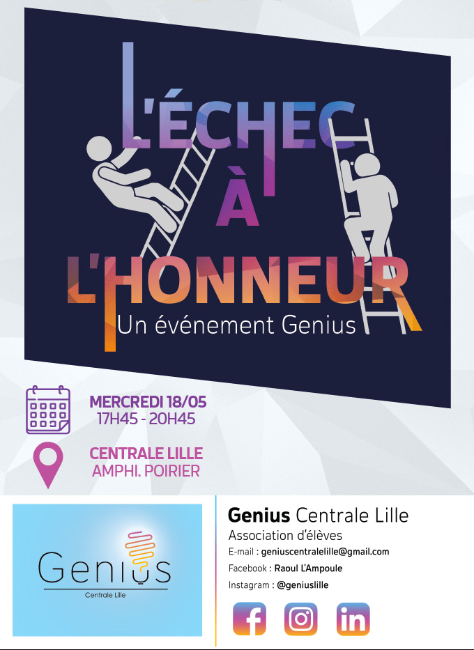 How can we successfully bounce back after a failure, or overcome doubt, error or disappointment to get back on track? Failure is a rewarding experience not to be overlooked according to Genius, the entrepreneurship association of the École Centrale de Lille.