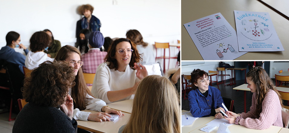 - Un jeu de cartes, Les Eurêkatrices, consistait à faire deviner par le dessin ou le mime des inventions faites par des femmes scientifiques via la recherche des dates de dépôts de brevet. L’occasion de prendre conscience que beaucoup d’objets de la vie quotidienne ont été inventés par des femmes. Les Eurêkatrices est un jeu créé par Gabrielle Regula, enseignante-chercheuse à l’institut matériaux microélectronique nanosciences de Provence (IM2NP).