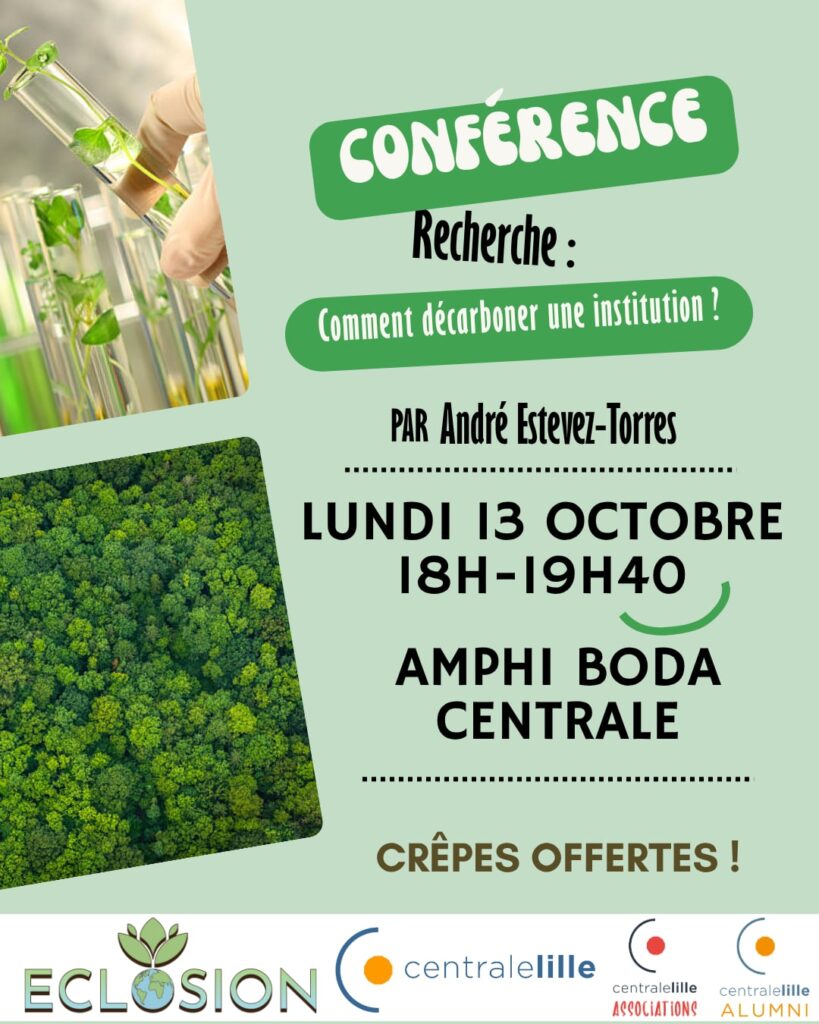 Comment réduire l’impact environnemental de Centrale et ses laboratoires ? Entre déplacement, immobilisation et achat, les activités de recherche de l’Institut occupent une grande part de son impact carbone (Rapport DDRS 2024). Éclosion, l’association de développement durable de Centrale Lille, vous propose de répondre à cette question avec M. André Estevez-Torres (Université de Lille, ex-CNRS/Sorbonne Université.